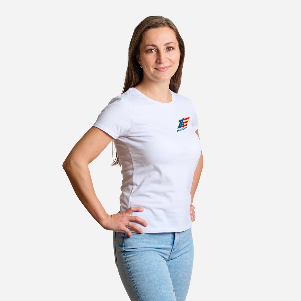 Dámské bílé tričko s logem hnutí Za Lužánky na srdci.