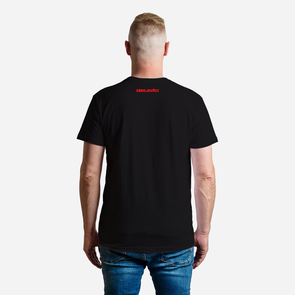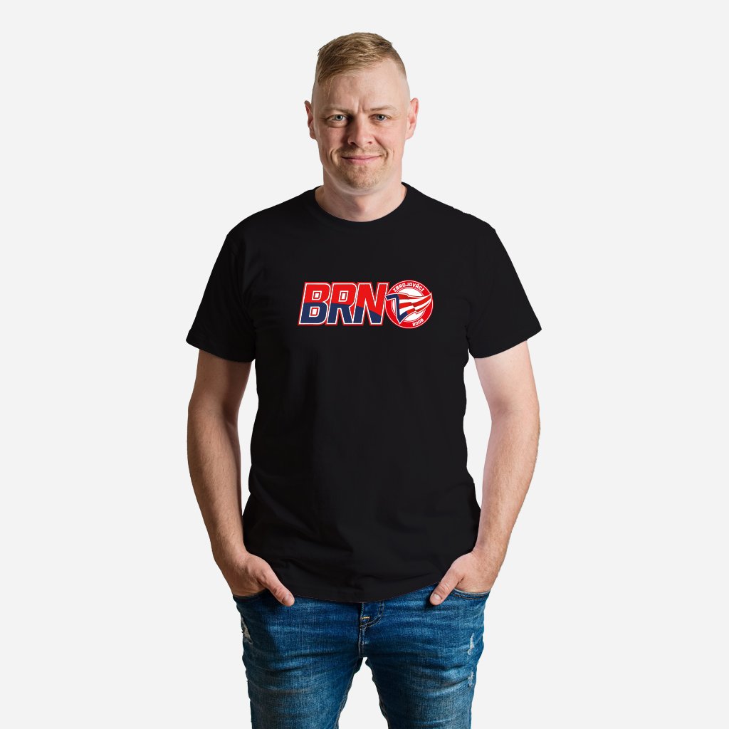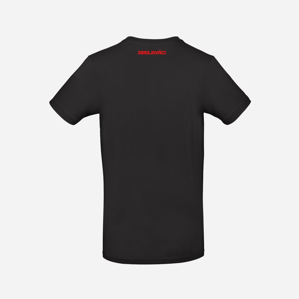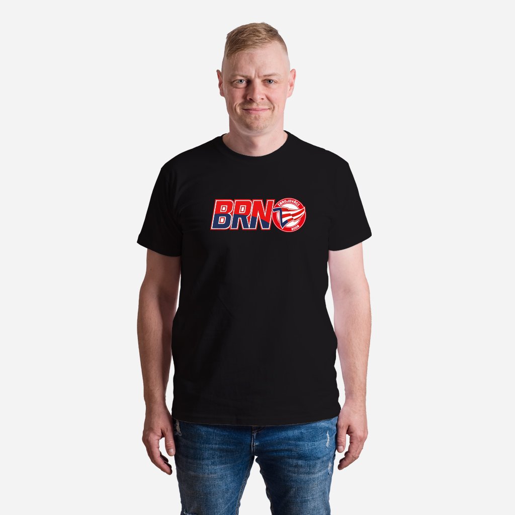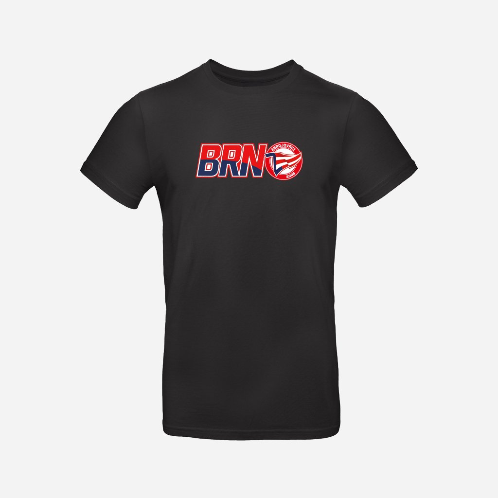 Pánské černé tričko s barevným nápisem BRNO, kde písmeno O znázorňuje logo Zbrojováků, a na zádech u krku je malý červený nápis: ZBROJOVÁCI.