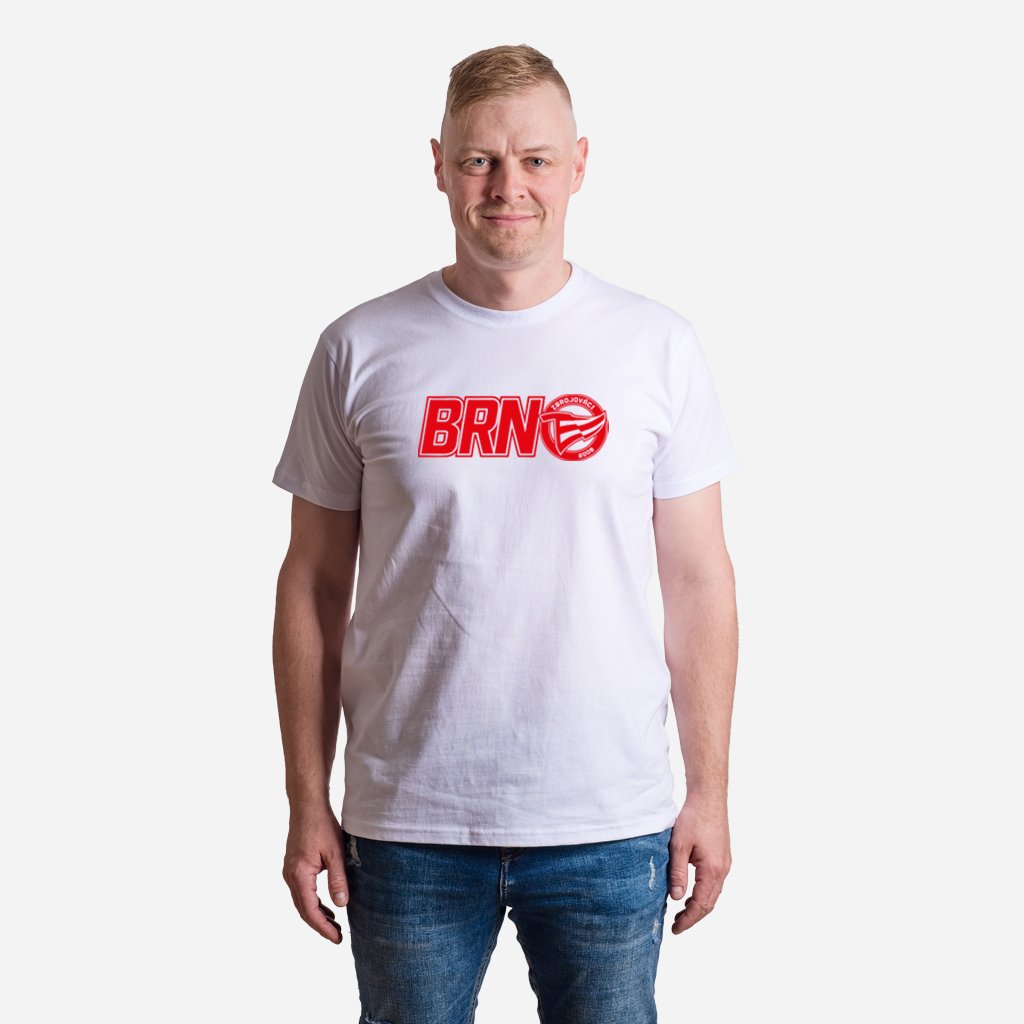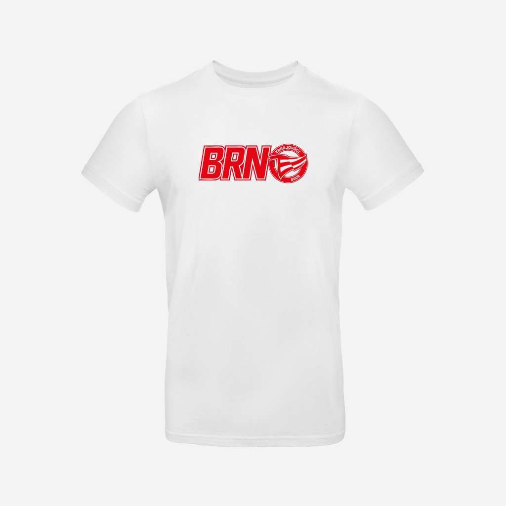 Pánské bílé tričko s červeným nápisem BRNO, kde písmeno O znázorňuje logo Zbrojováků, a na zádech u krku je malý červený nápis: ZBROJOVÁCI.