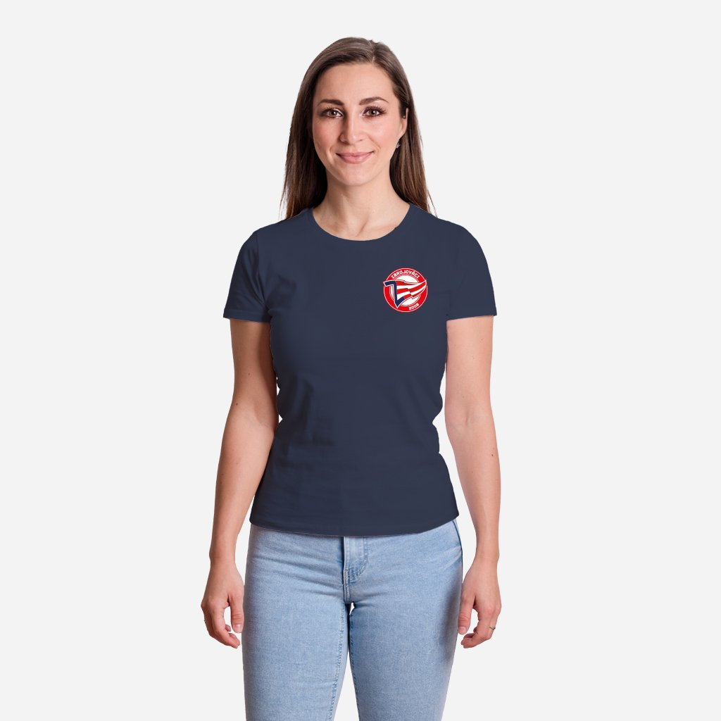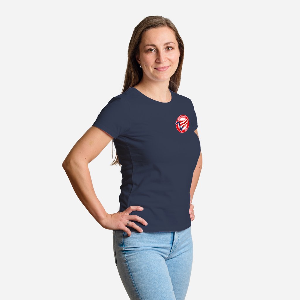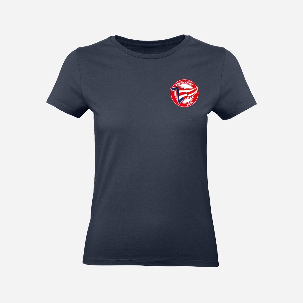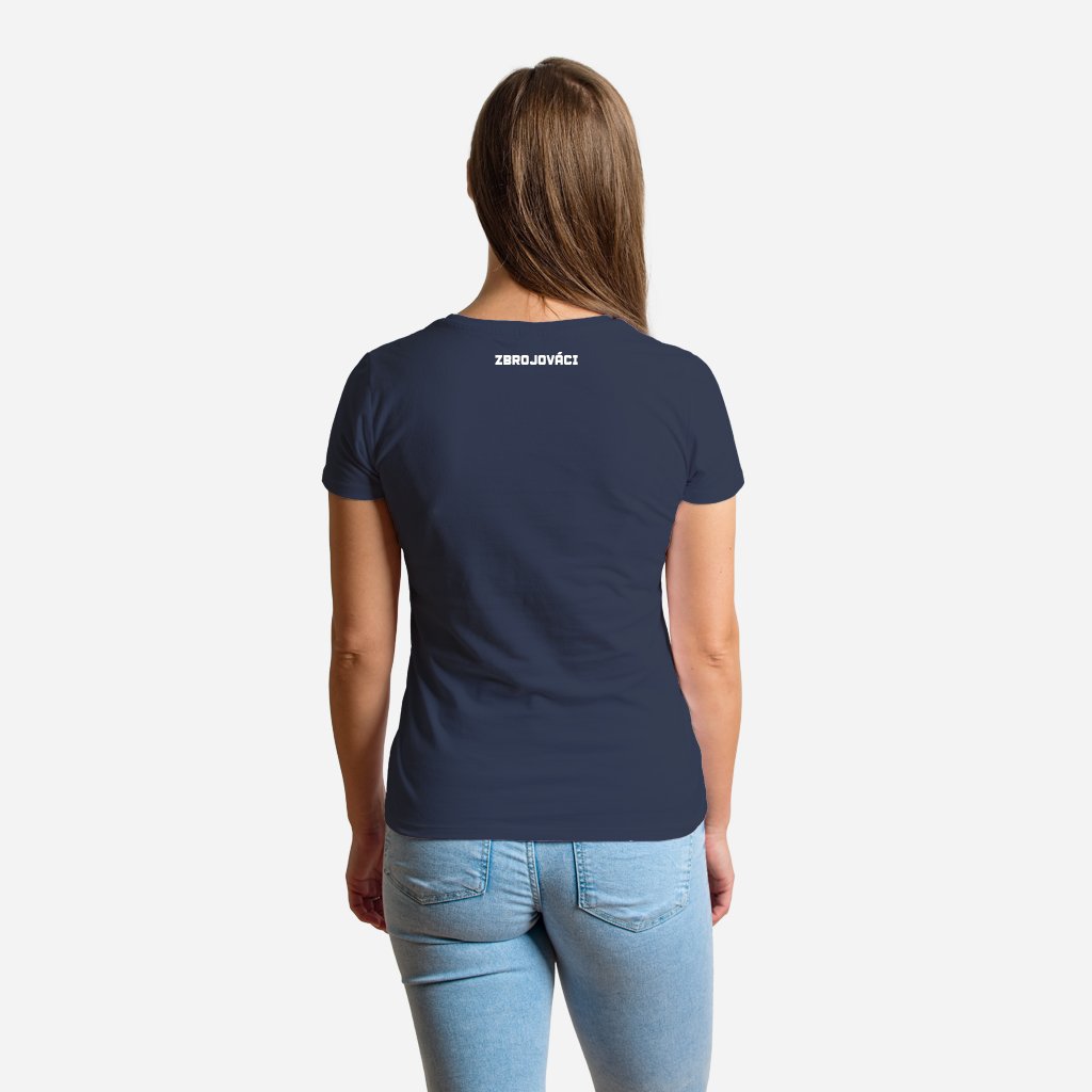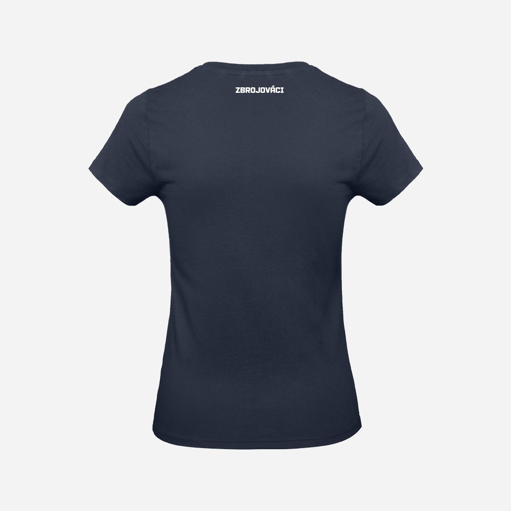 Dámské tmavě modré tričko s barevným logem Zbrojováci na srdci a na zádech u krku je malý bílý nápis: ZBROJOVÁCI.