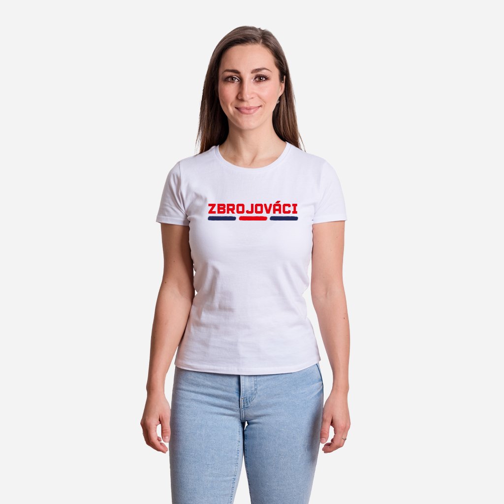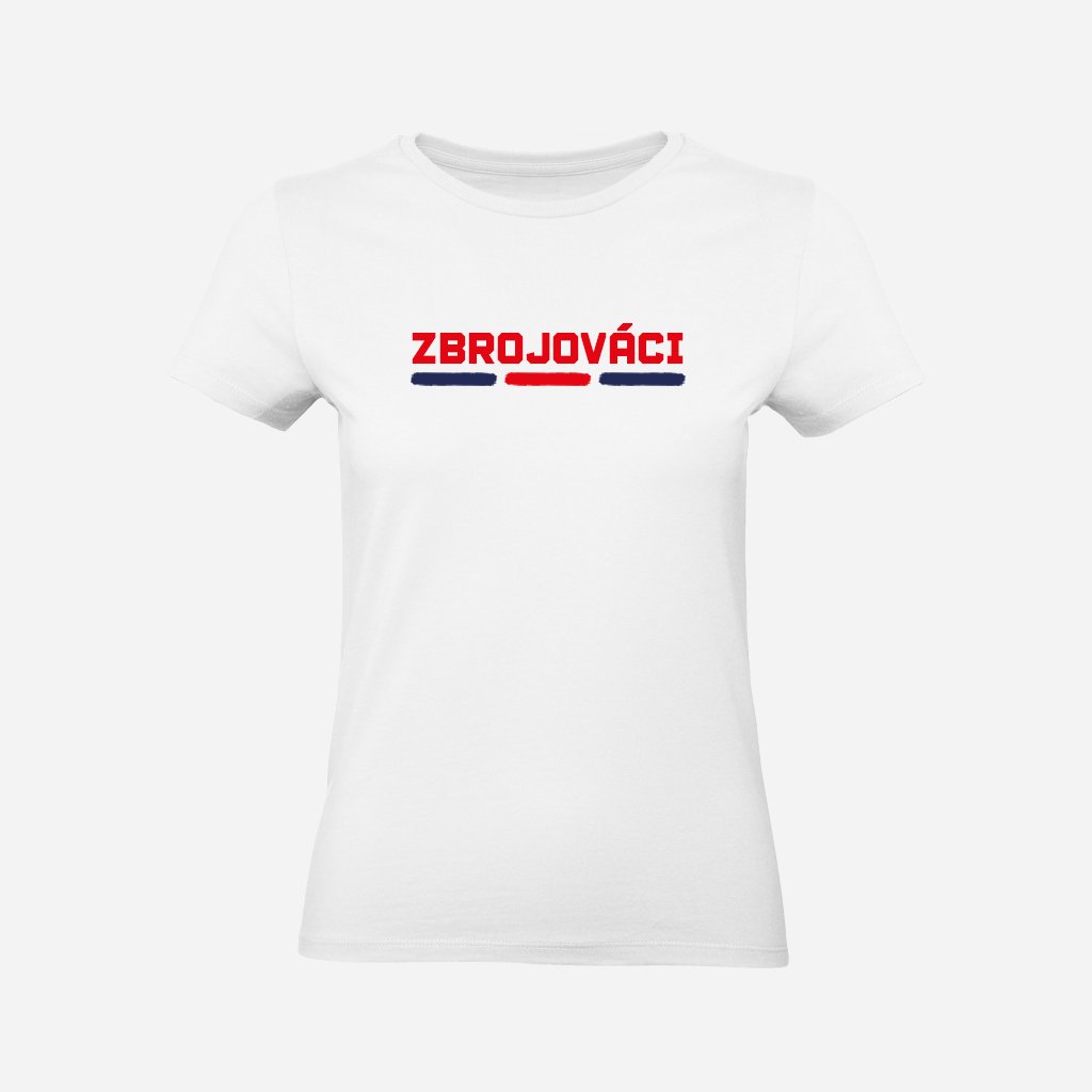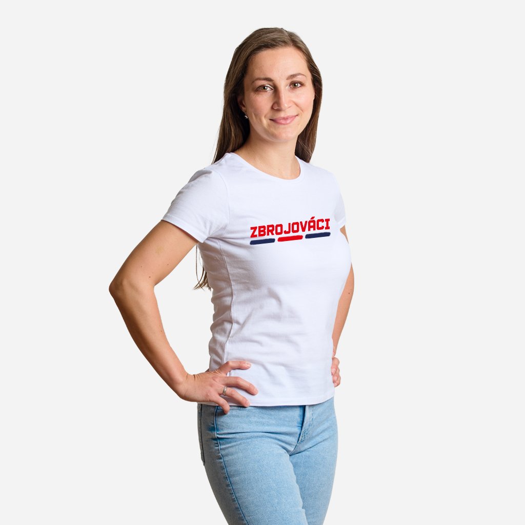 Dámské bílé tričko s červeným nápisem ZBROJOVÁCI a na zádech u krku je malý červený nápis: ZBROJOVÁCI.