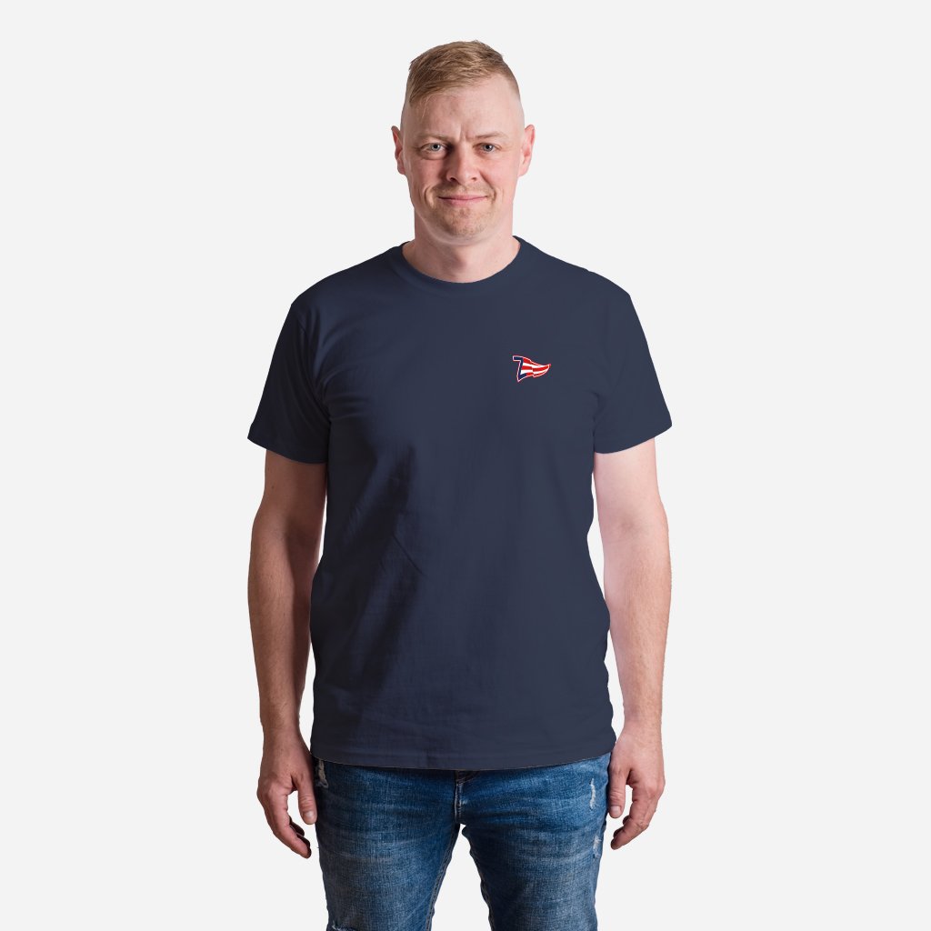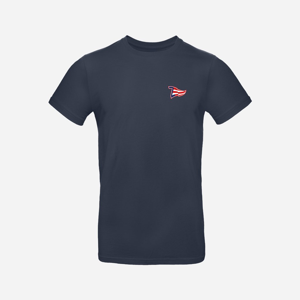 Pánské tmavě modré tričko s barevnou zbrojováckou vlaječkou na srdci a na zádech u krku je malý bílý nápis: ZBROJOVÁCI.